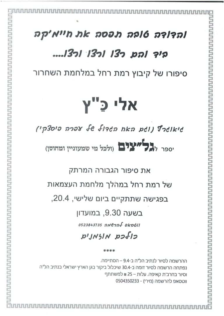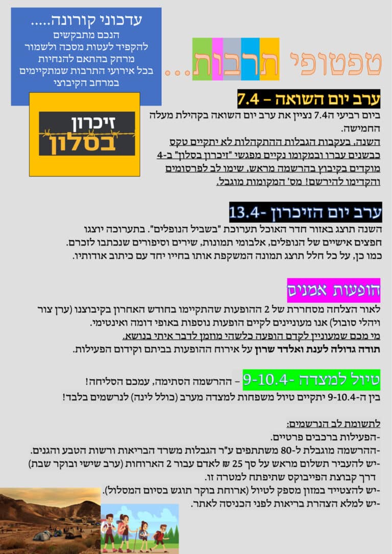 ביום חמישי, 8.4.21, תערך בכניסה לקיבוץ מעלה החמישה עצרת לציון יום הזיכרון לשואה ולגבורה.