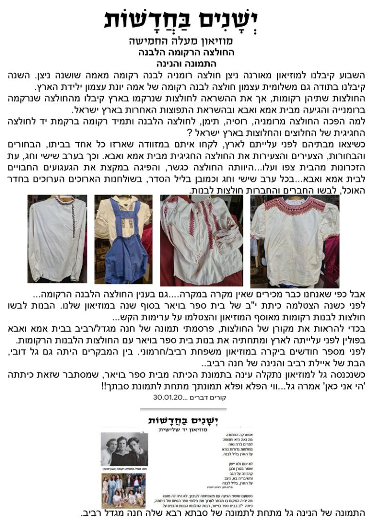 (שרה'לה על הצילום) וכלה בסיפורי "והגדת לבנך" מפי יונה פריטל ונורית גנני שהיו מרתקים.