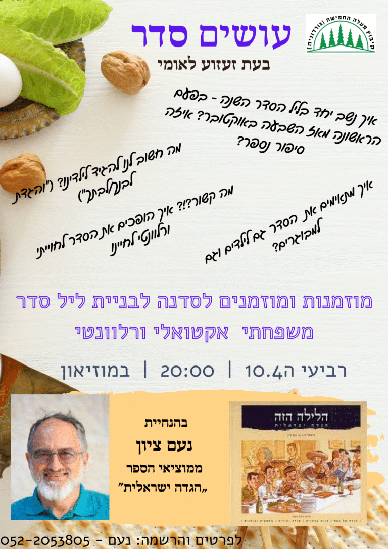 ביום רביעי ה-10.4 נעם ציון יגיע אלינו למעלה החמישה למפגש מיוחד שבו נחשוב איך לבנות ולהתאים את ליל הסדר לעת הזאת. המשתתפים בסדנה יקבלו במתנה עותק של המהדורה המיוחדת של ההגדה.