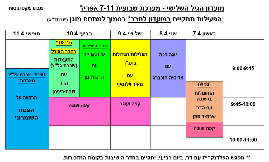 יום רביעי | 08:00 – 11:00 | חופש | 15:30-18:30 |