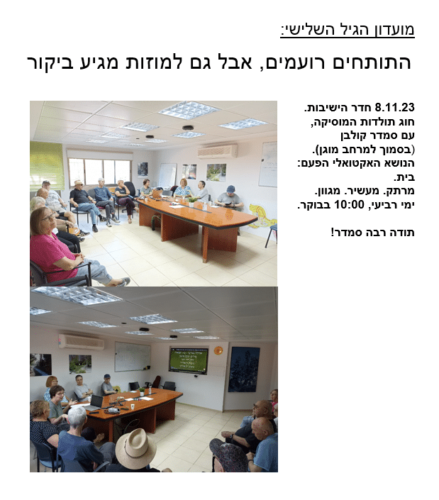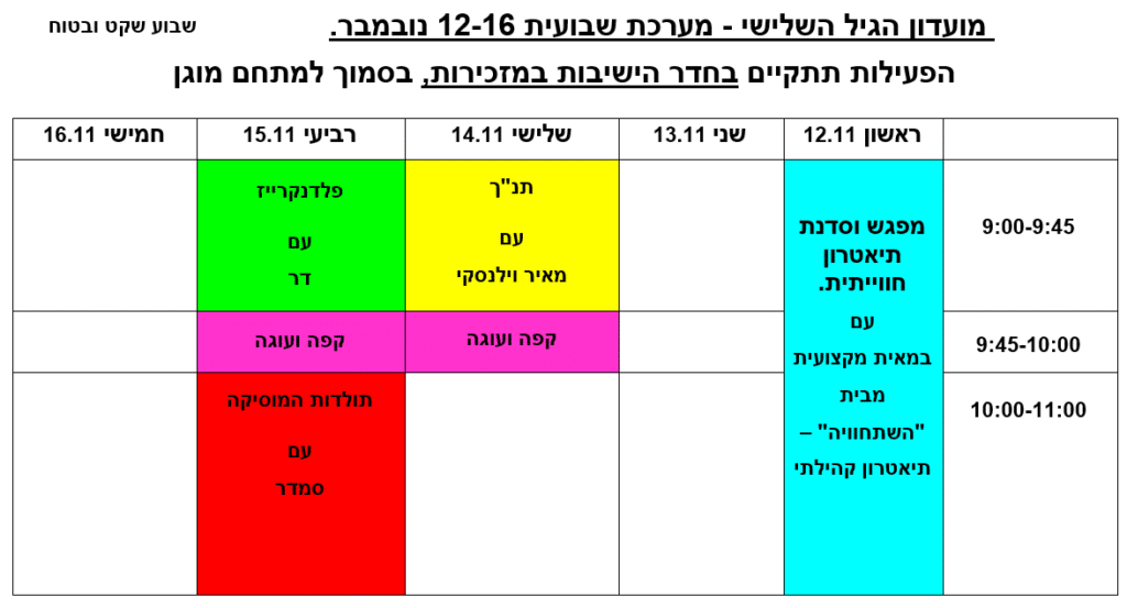 בימים אלה אנו משאירים את כל המתחמים הציבוריים, לרבות מועדון החברים, פתוחים, וזאת בכדי לאפשר התגוננות במרחבים מוגנים בשעת אזעקה.