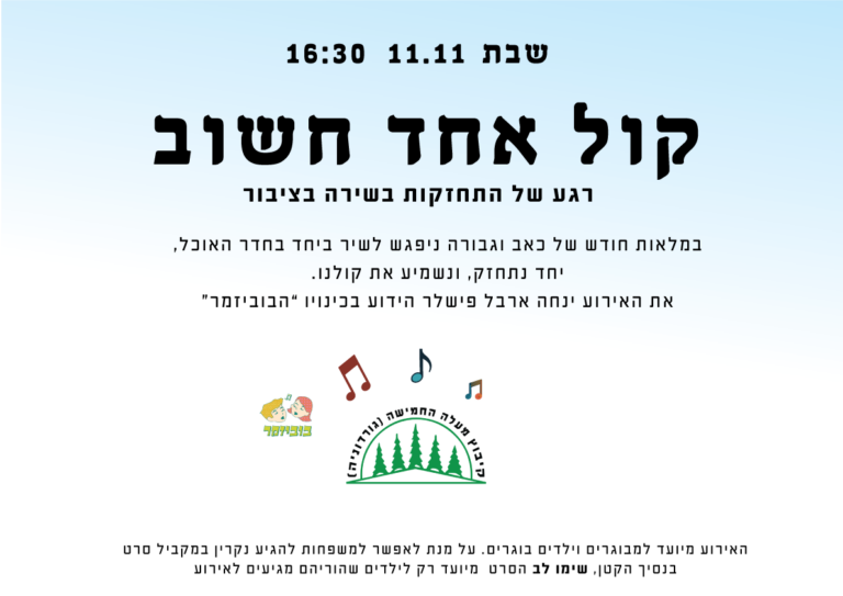 ביום שבת בשעה 16:30 ניפגש על הדשא מעל הבמה לשירה בציבור.