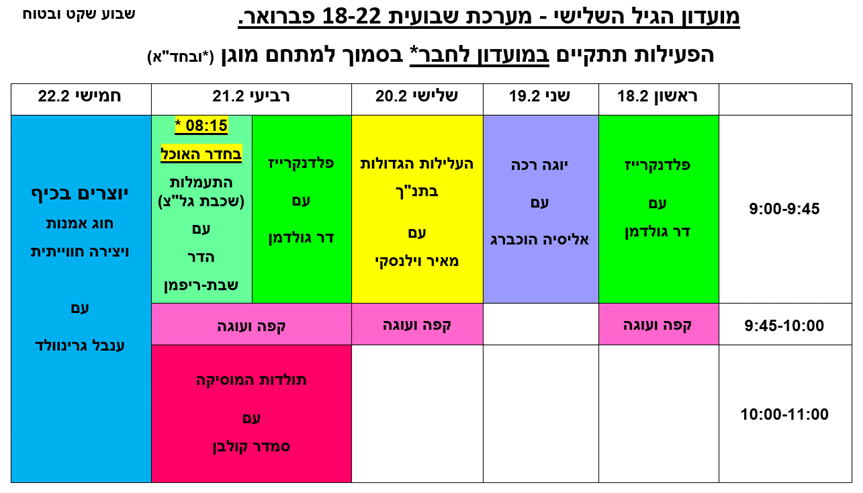 | יום רביעי 21.02.2024 | 11:00 – 08:00 18:30 – 16:30 | 18:00 – 15:00 | 15:30-18:30 |