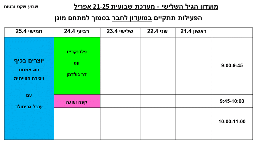 יום רביעי | 08:00 – 11:00 | 08:00 – 11:00 | 08:00 – 11:00 |