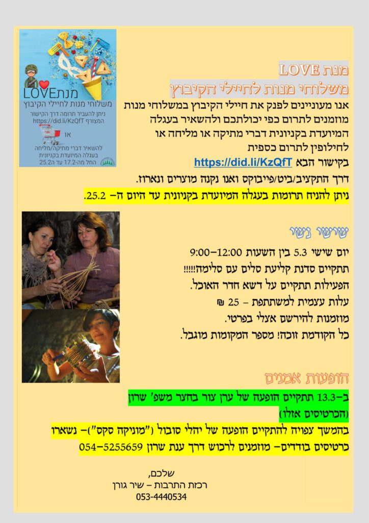 אנחנו מזכירות לכם שכמו תמיד אנחנו כאן בשבילכם, ומי מכם שמרגיש שרוצה להתייעץ, לקבל תמיכה או סתם לשתף עם גורם מהקיבוץ ניתן לפנות לנציגות צוות מוגנות:
