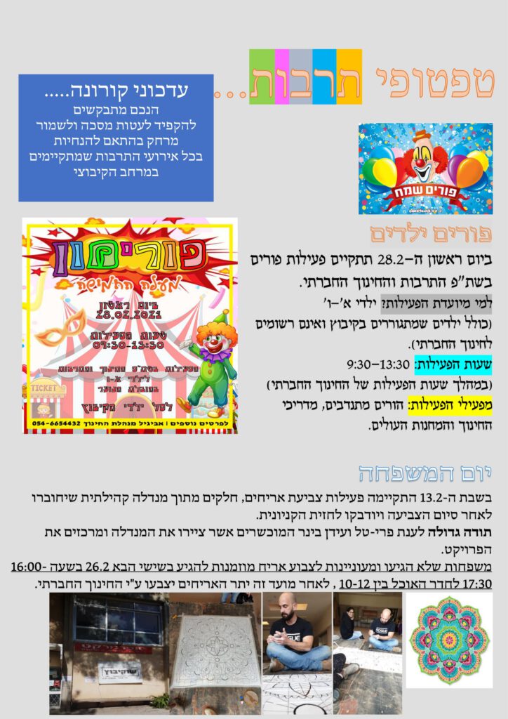 - ביום א' התקיים מפגש פעימה 6 בנוכחות יו"ר הקיבוץ, מנהל עסקים ומנהלת קהילה.