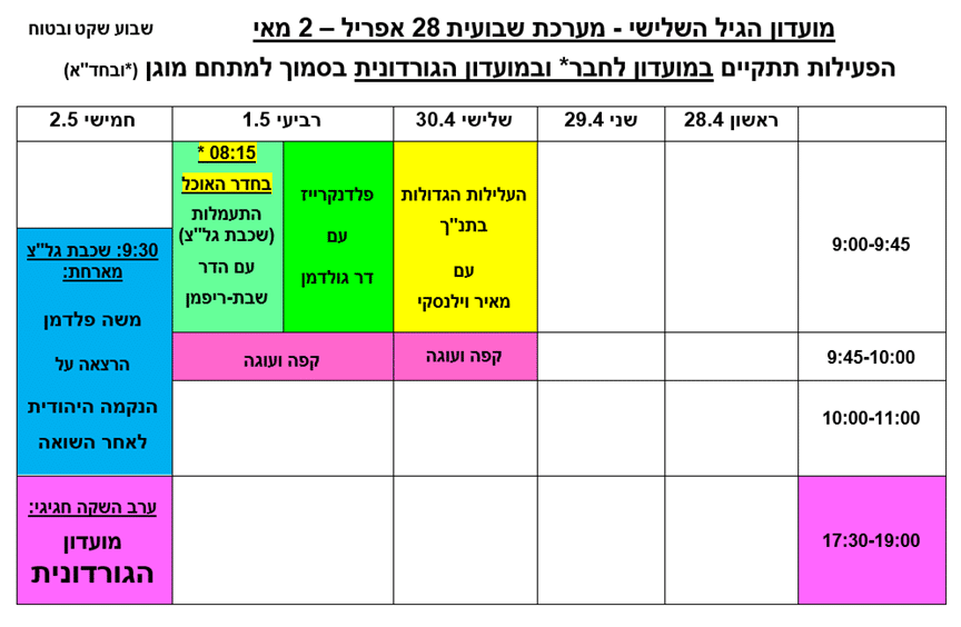 יום ראשון 28.04.2024 | 7:30-09:30 | ערב חג | 07:30-09:30 |